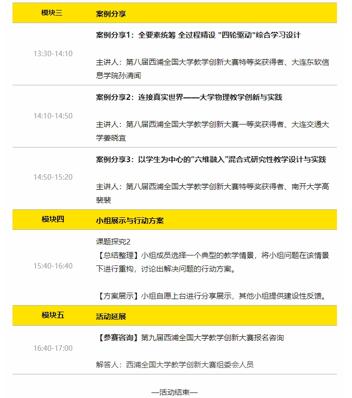 此次研讨会将邀请教育专家和往届西浦全国大学教学创新大赛获奖选手,分享他们在教育改革中的前沿教育理念和优秀教学实践,并邀请参与老师们聚焦高阶学习目标、学生学习活动、课程考核方式这三个教学中的核心方向展开系列研讨。具体参会事宜如下: