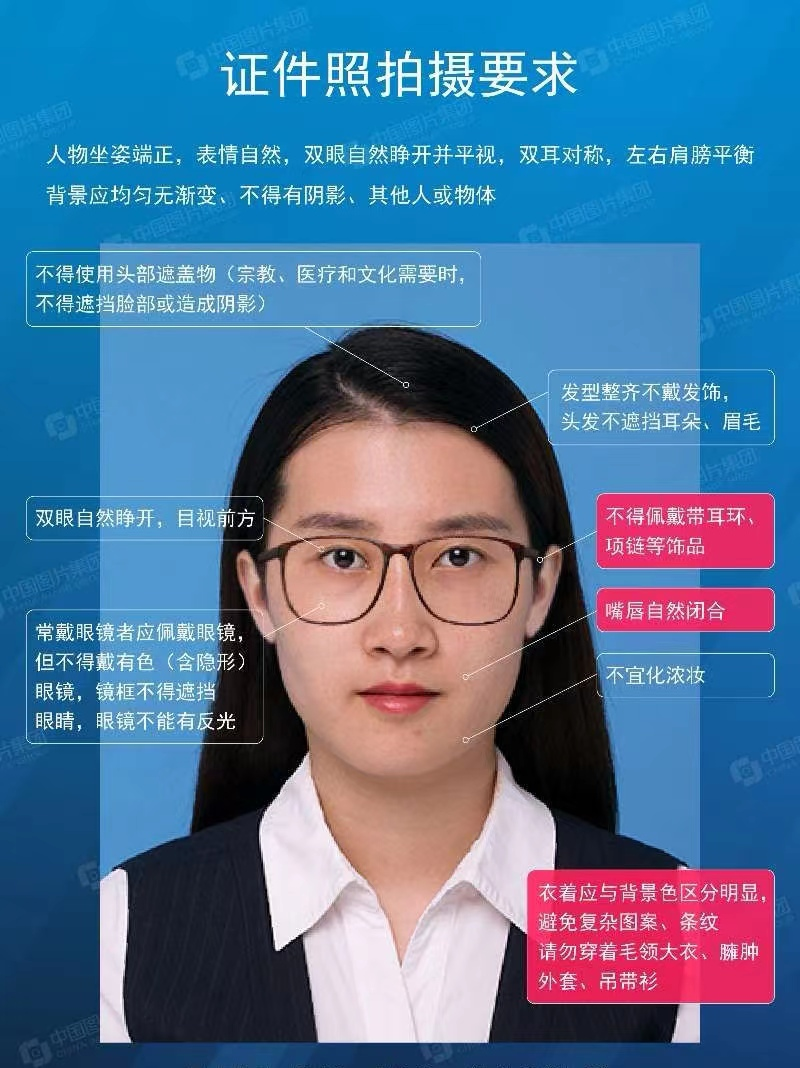 2.衣着:应与背景(蓝色)区分明显。建议着白衬衫,避免复杂图案、条纹。
