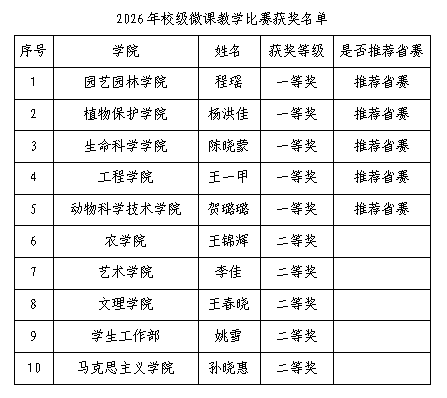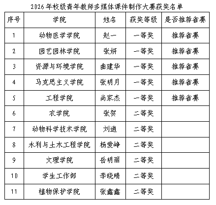 按照黑龙江省高校师资培训中心印发的《关于举办第十三届黑龙江省高校青年教师多媒体课件制作大赛的通知》和《关于举办第十三届黑龙江省高校微课教学比赛的通知》精神,教务处组织了校级多媒体课件制作大赛和微课教学比赛。经各相关学院初审推荐、教务处复审以及专家组评审,最终评选出一等奖10名、二等奖11名,其中,拟推荐一等奖获奖教师代表学校参加省赛,现将评选结果公示,公示期为2026年4月22日至4月24日。
