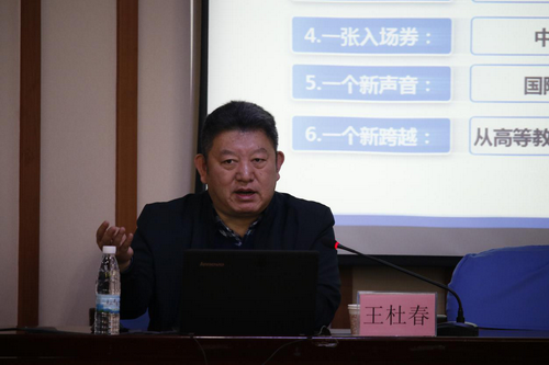 继续教育学院院长王杜春教授作《新时代高等教育发展、高校教学改革和教师使命职责》的专题报告