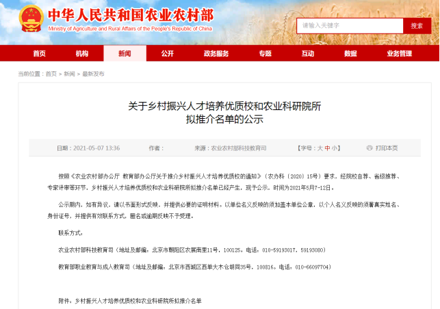 近日,国家农业农村部公布了乡村振兴人才培养优质校和农业科研院所推介名单,我校成功入选。