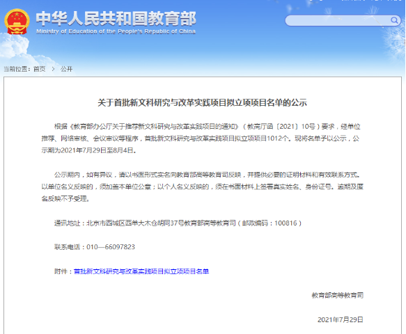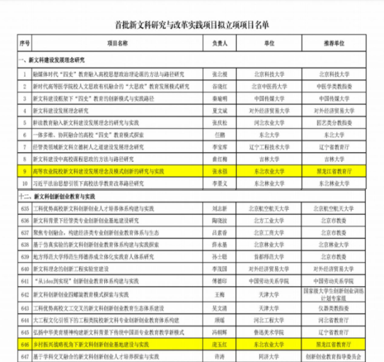 近日,教育部高等教育司发布了《关于首批新文科研究与改革实践项目拟立项项目名单的公示》,我校党委副书记兼工会主席庞玉红申报的《乡村振兴战略视角下新文科创新创业基地建设与实践》、教务处处长张永强申报的《高等农业院校新文科建设发展理念及模式创新的研究与实践》2个项目成功立项。
