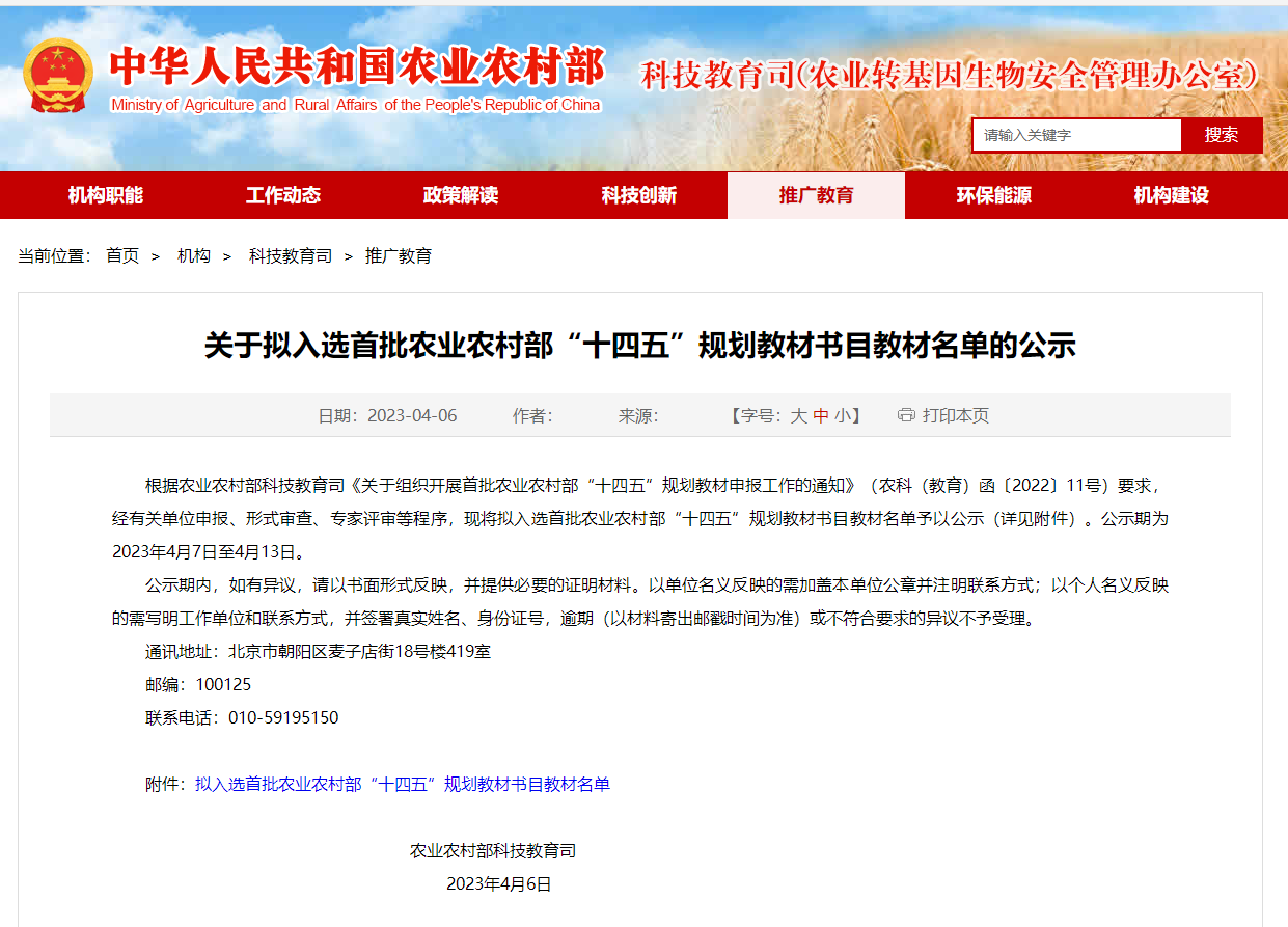 4月6日,农业农村部科技教育司公布了入选首批农业农村部“十四五”规划教材遴选结果,全国共有1481部教材入选,其中,普通高等教育教材(包括本科教育和研究生教育教材)入选1189部,我校主编的65部教材入选,占普通高等学校立项教材总数的5.5%。