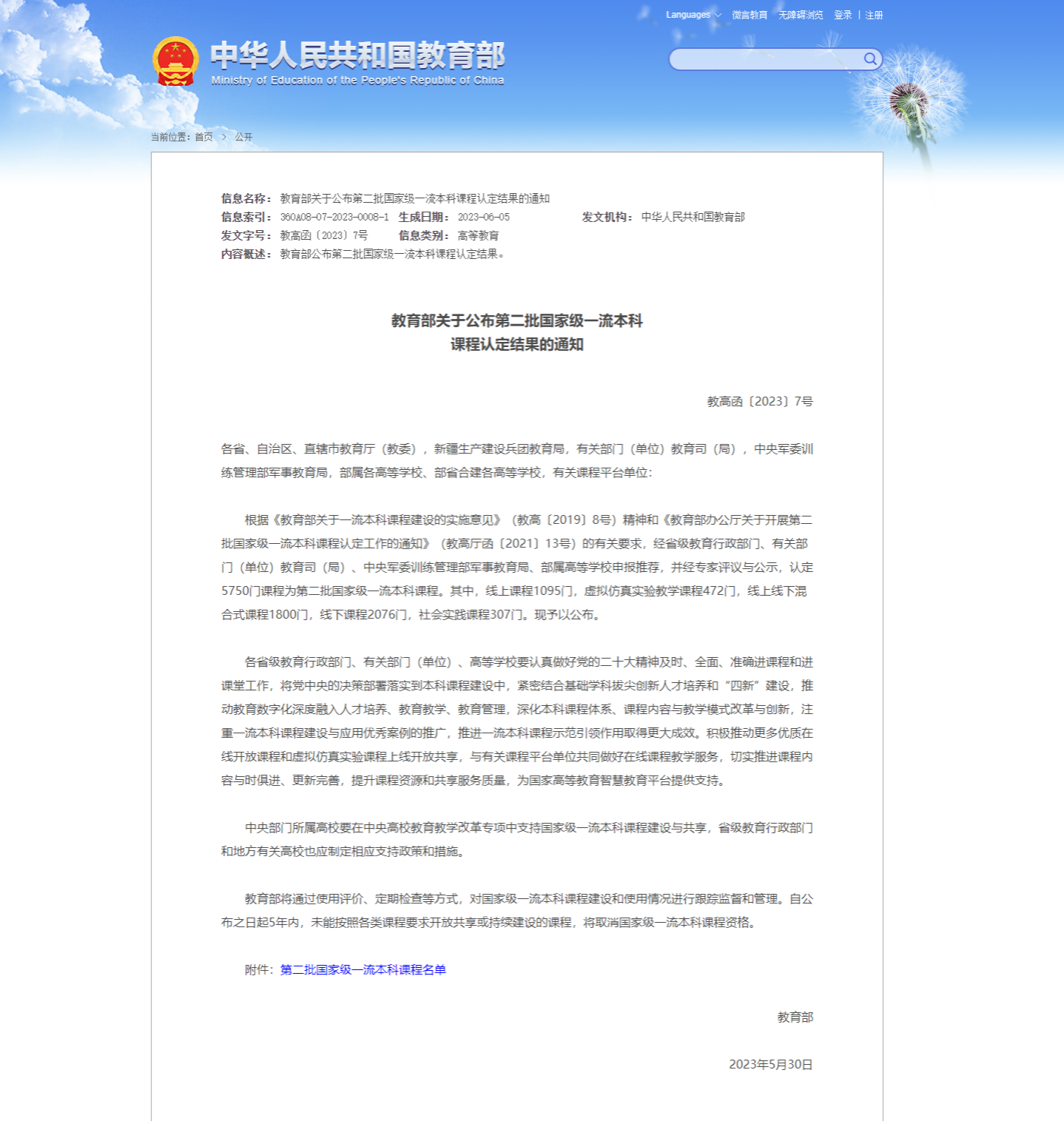 4月11日,教育部发布了《关于第二批国家级一流本科课程认定结果的公示》,我校推荐的15门课程参加本次评选,其中12门课程入选国家级一流本科课程,取得了历史性的新突破。