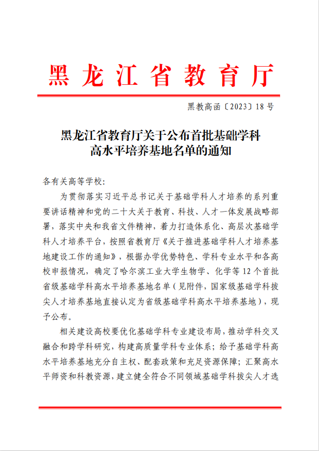 3月24日,黑龙江省教育厅公布了首批基础学科高水平培养基地名单,东北农业大学获批省级生物学基础学科高水平培养基地。