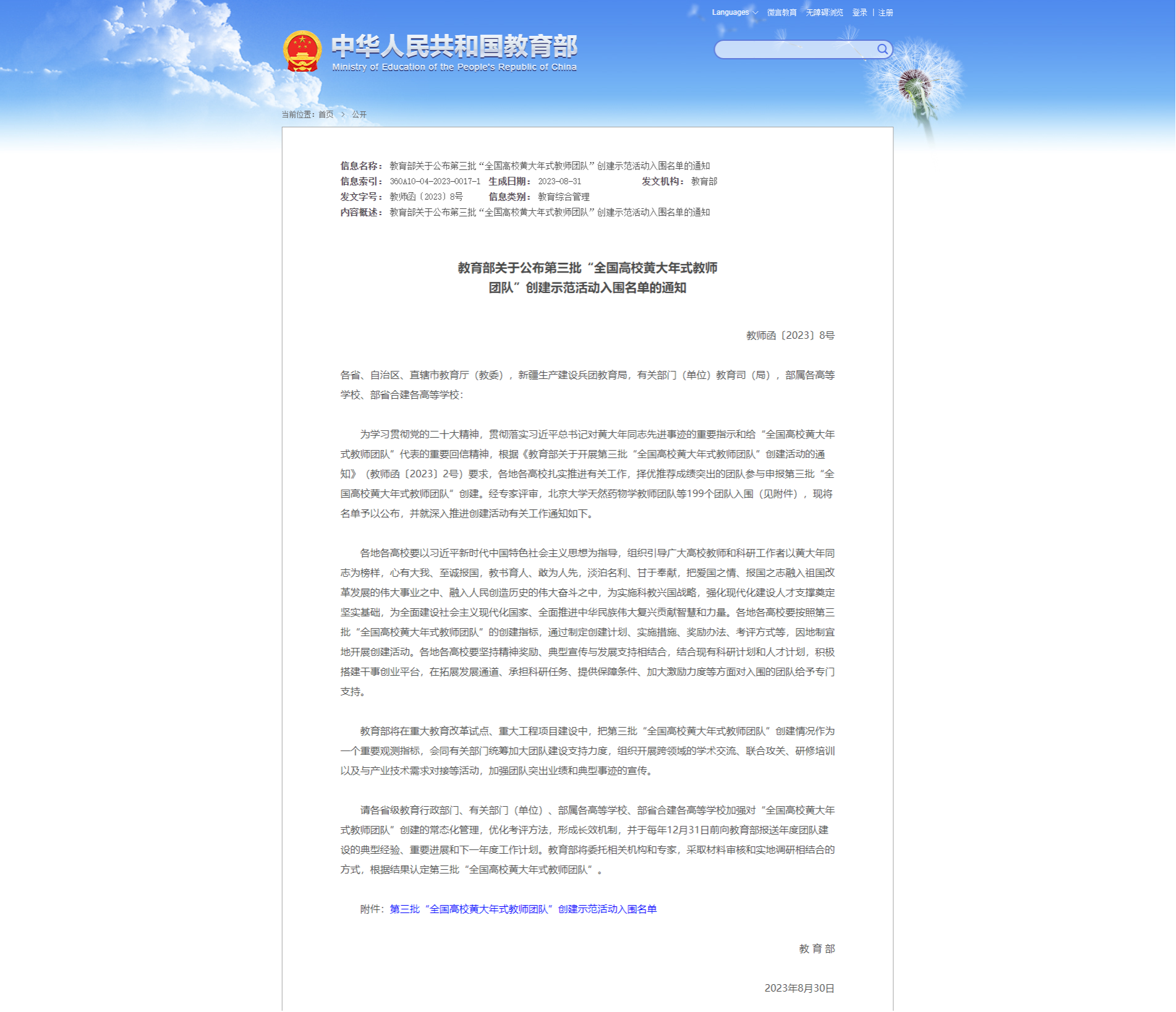 8月30日 ,教育部发布了第三批全国高校黄大年式教师团队创建示范活动入围名单,我校食品学院江连洲教授领衔的“大豆高值化加工技术与应用教师团队”成功入选。