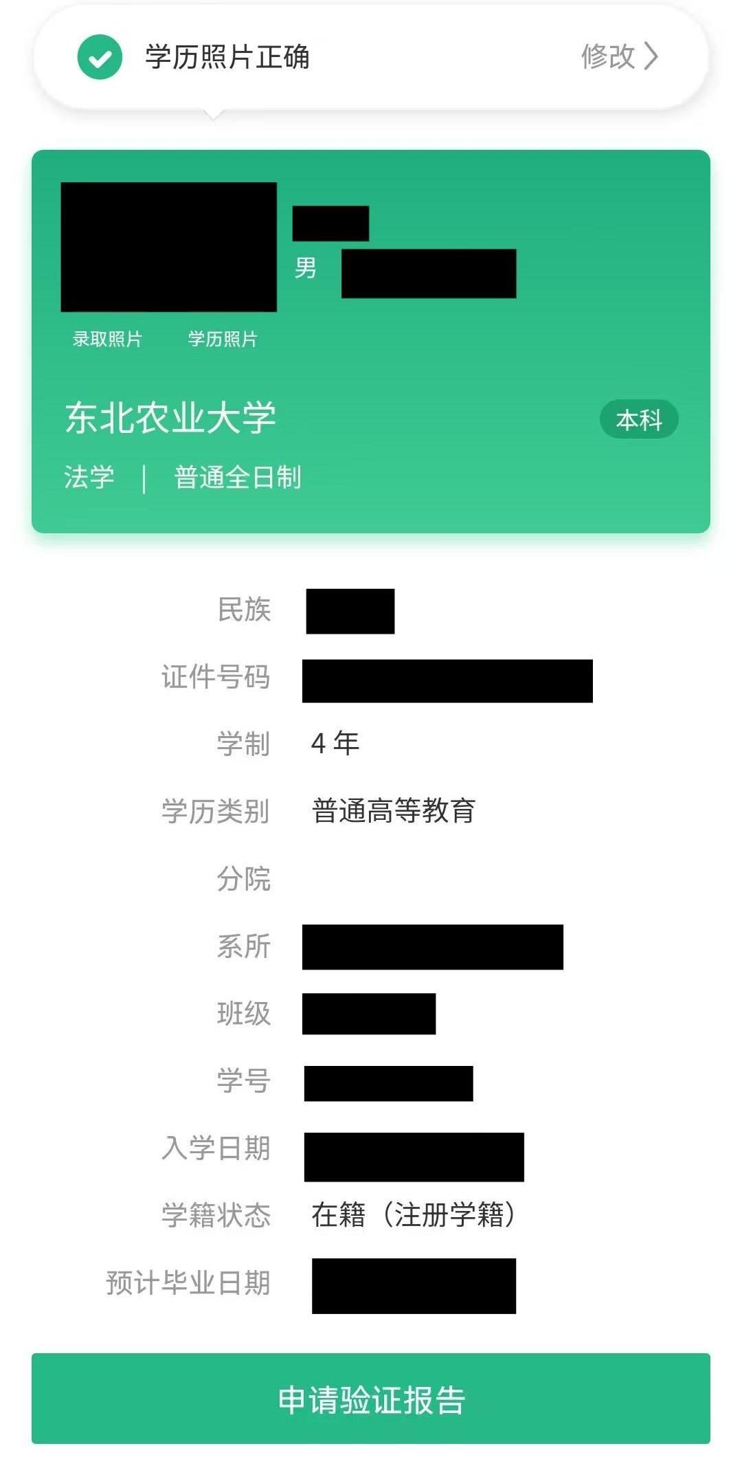 1.进入学信网登录“学籍学历学位”,点击“学籍信息”,校对学籍基本信息(姓名、性别、出生日期、民族、证件号码、专业名称、学制、入学日期、预计毕业日期等;学籍信息中“分院”为空属于正常情况无需修改)和图像信息,图像无误点击“正确”。