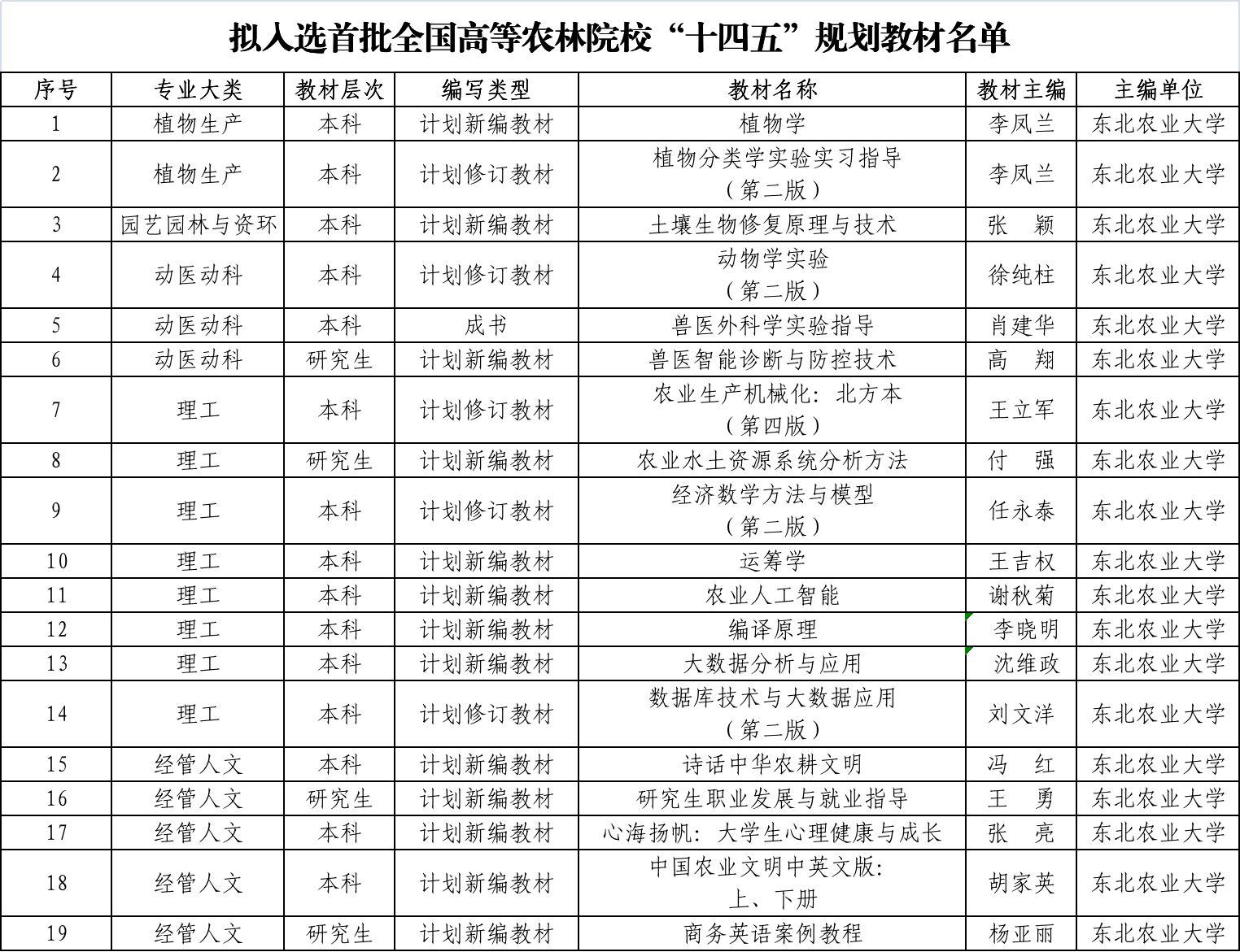 根据中国农学会教育专业委员会《关于开展全国高等农林院校“十四五”规划教材建设工作的通知》要求,经学校组织推荐,中国农学会教育专业委员会形式审查、专家评审等程序,9月10日中国农学会公布了拟入选首批全国高等农林院校“十四五”规划教材名单,我校《农业水土资源系统分析方法》等19部教材成功入选,在入选高校中位居前列。