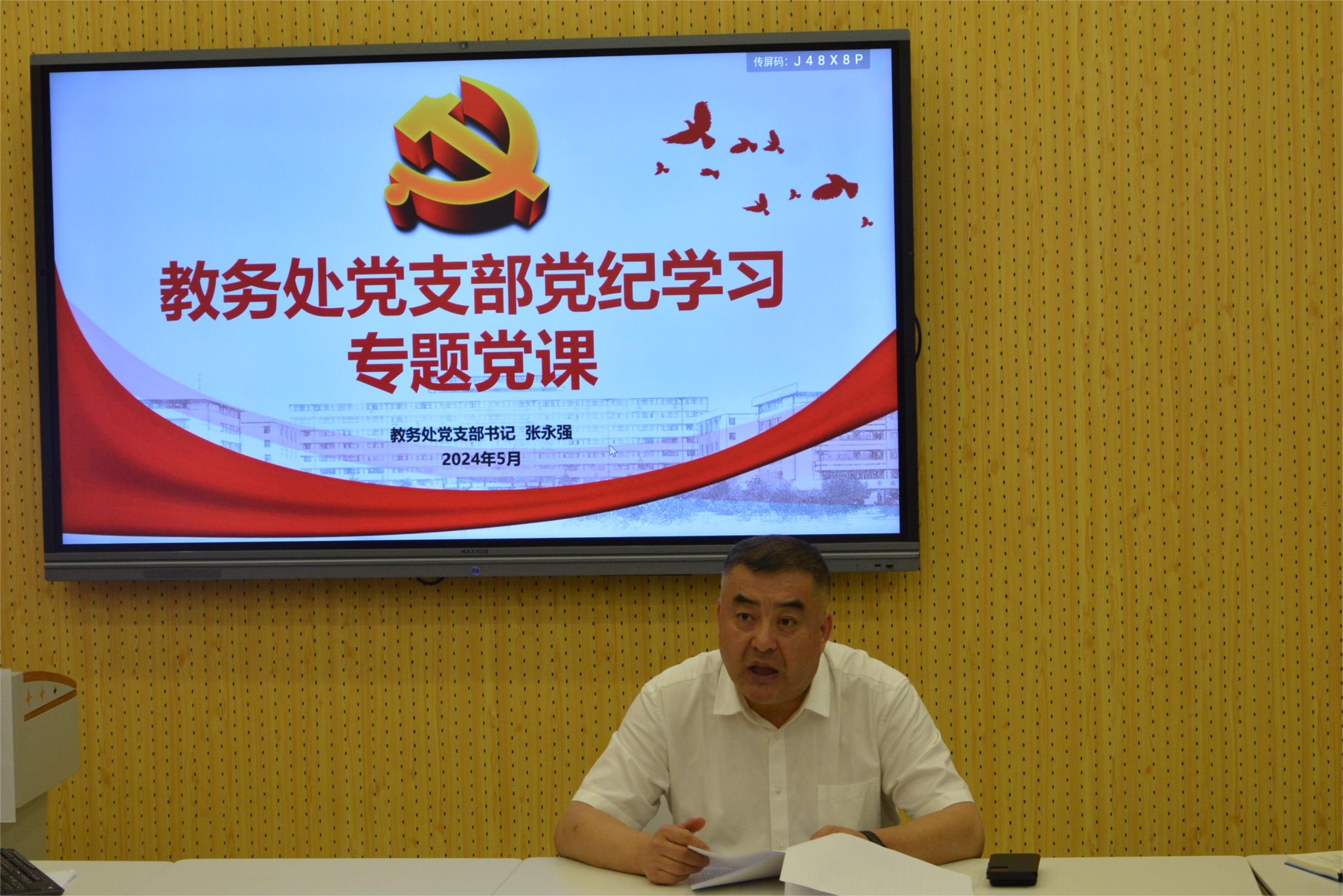 为深入学习贯彻习近平总书记关于全面加强党的纪律建设的重要论述,做好关于全党开展党纪学习教育的统一部署,5月29日,教务处党支部书记张永强在主楼532讲授了题为“党纪立身,正道直行”专题党课,结合教务处实际工作情况,详细解读中共中央新修订印发的《中国共产党纪律处分条例》(以下简称《条例》)。